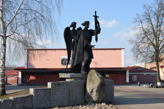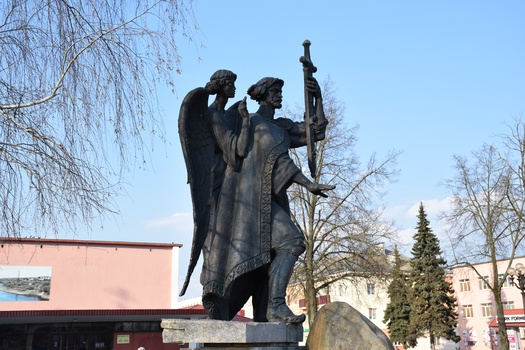 Помнік князю Барысу Ўсяславічу ўяўляе сабою шасцімятровую скульптурную кампазіцыю з дзвюх постацяў. Князь Барыс прадстаўлены на пярэднім плане ў княжым адзенні XII стагоддзя, у яго левай руцэ накіраваны лязом у зямлю меч-крыж, які ўзвышаецца над яго галавой. Далонню другой рукі князь паказвае на зямлю, дзе павінен быць закладзены будучы горад. За плячом князя постаць анёла-ахоўніка.