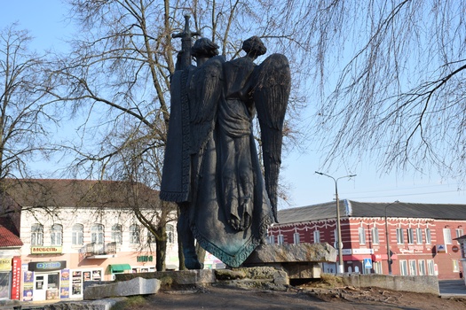 Скульптурная кампазіцыя ўсталявана на двух'ярусным пастаменце, які ўрэзаны ў чвэрць радыусу невялікага ўзгорка. Пастамент і чвэрць узгорка з двух бакоў апраўлены плітамі няправільнай формы. У падножжа скульптурнай кампазіцыі валун з годам заснавання горада.